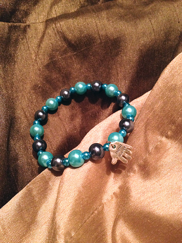 Armband gjort med blåa pärlor, varvat med mindre blåa pärlor. Har valt att bryta av med mörkare pärlor i en blå nyans. Som detalj har armbandet en hand med texten "Hand Made". Detta armbandet är gjort med elastiskt band för att underlätta att ta på sig. Pris: 100kr